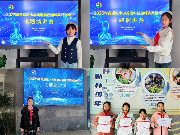 本次活动历经校级初选与区级复赛两轮角逐。在区小学英语科普趣味实践活动中,我校五(6)班朱一辰同学荣获一等奖,五(2)班孙薇凌、四(6)班胡诗远两位同学荣获二等奖,五(5)班俞可懿同学荣获三等奖。其中,朱一辰、孙薇凌、胡诗远三位同学入围区级主题演讲决赛,在90组个人及团队选手的现场比拼中,凭借自信从容的台风与流利的英语表达,赢得评委一致好评。